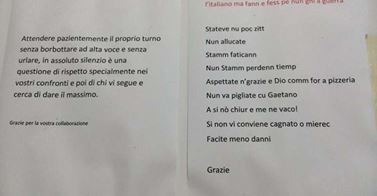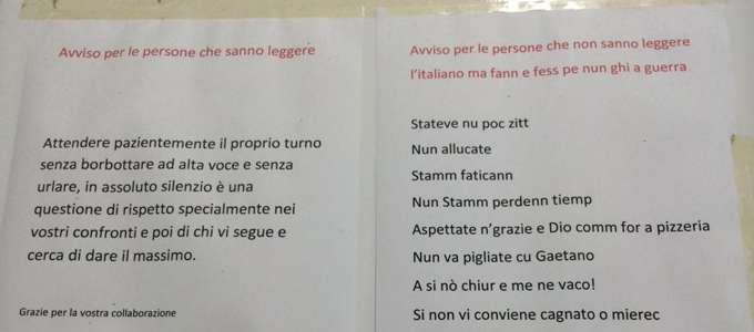 Su Facebook è stata postata una foto che sta facendo il giro del web: un invito al silenzio nel rispetto del prossimo e di chi esercita una  professione (quella medica) che non permette distrazioni e cali d’attenzione,  la particolarità è nell’avviso, stampato in italiano, poi ribadito in napoletano con una premessa intrisa di un sarcasmo che si attesta nel solco della migliore tradizione partenopea e campana” Avviso per tutte le persone che ( non) sanno leggere l’italiano ma fann e fess pe nun ghi a guerra” avviso in napoletano2Originalità e simpatia a parte, l’invito è legittimo, andare in uno studio medico, specie in quello del “medico di famiglia” spesso diventa un’occasione di ritrovo per persone che non si vedono, o non si sentono da tempo, la cosa di per sé non ha nulla di male tranne nelle occasioni in cui si tende ad esagerare con il vocio suscitando il disappunto del professionista di turno, che in questo caso ha pensato bene di concludere il suo messaggio vernacolare con un caustico “se non vi conviene cagnate o mieric, facite meno danni”.