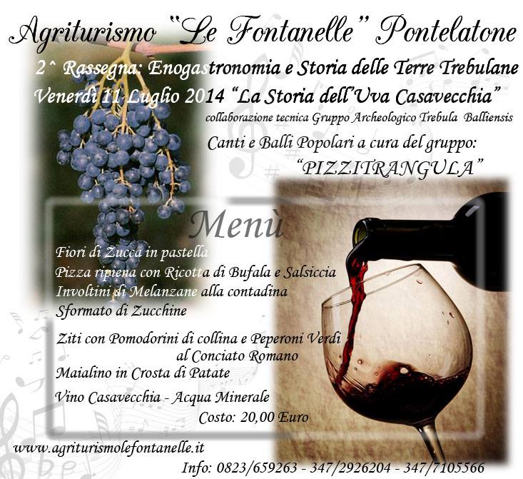 Anche quest’anno si rinnova l’appuntamento con questa rassegna, organizzata dall’ Agriturismo le Fontanelle di Pontelatone(CE), protesa nel favorire un momento di confronto tra cultura e enogastronomia, tra modernità e tradizione. Il progetto è costruito in collaborazione con altre realtà culturali del Casertano: Il Gruppo Archeologico Trebula Balliensis, ed il gruppo di musica popolare Pizzitrangula. L’intento è quello di valorizzare le diverse espressioni socio–culturali e gastronomiche locali, rivitalizzando gli antichi legami con la vita di campagna. Un impulso che nasce principalmente dall’ amore verace per il posto natio, per le radici che ci legano indissolubilmente alle origini contadine. Il fine ultimo consiste nel divulgare la storia dell’uva Casavecchia, attualmente registrata come quarta DOC della provincia di Caserta (dopo Asprinio, Falerno e Galluccio). Ci auguriamo pertanto che questo vitigno possa divenire una priorità culturale, prima che gastronomica, delle Terre del medio Volturno. Ricordiamo che “Il Casavecchia” è un vitigno autoctono che ha origini antichissime, in pochi anni si è affermato sul panorama enologico nazionale. Si produce principalmente nel quadrilatero comprendente i comuni di Castel di Sasso, Formicola, Liberi e Pontelatone, e sulle colline del Caiatino; dopo un periodo di oblio, è stato riscoperto e valorizzato dalle nuove generazioni, tanto da divenire un dei vini più ricercati dell’alto casertano. Il territorio di Pontelatone, inoltre, da poco tempo si può anche fregiare del titolo di “Città del Vino” e al Casavecchia di Pontelatone è stato riconosciuto il marchio DOC con D.M. del 30.11.2011.