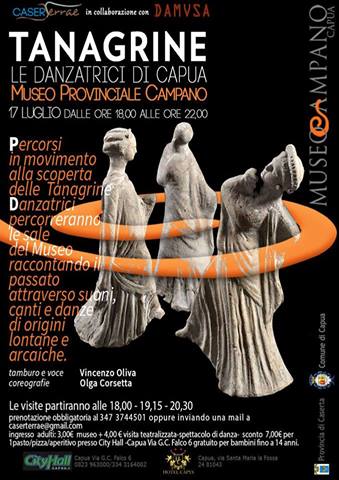 Il 17 luglio, al Museo Provinciale Campano di Capua, CaserTerrae e Damusa realtà impegnate nella promozione e valorizzazione del territorio della provincia di Caserta, vi accompagneranno con danze e racconti alla scoperta delle Tanagrine, le antiche danzatrici di Capua. L’evento prevede una visita teatralizzata nelle sale del Museo e in particolare in quella delle “Tanagrine”, meravigliose sculture in terracotta del III sec a.C., raffiguranti donne ammantate e danzatrici, provenienti da corredi tombali e tutte ritrovate nell’antico fondo Patturelli a Curti (CE). Tre Tanagrine prenderanno vita e condurranno il visitatore in un’atmosfera del tempo passato nelle sale del museo. Lo spettacolo si concluderà poi con un momento molto intenso, caratterizzato dal ballo sul Tamburo, la cosiddetta Tammurriata (dallo strumento a percussione chiamato tammorra), tipica danza campana. Parteciperanno all’evento anche il percussionista Vincenzo Oliva,la ballerina di danze popolari Olga Corsetta e l’artista Lina Graziano con le sue terrecotte di ottima fattura ispirate alle Tanagrine.