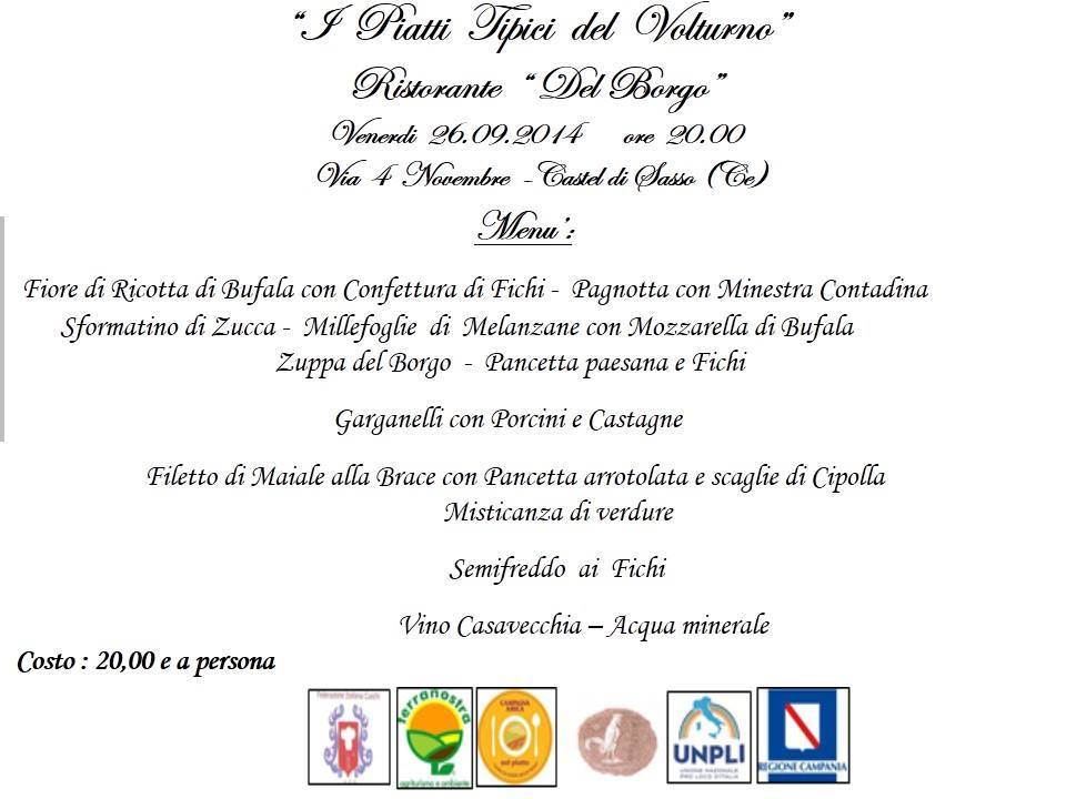 Venerdì 26 settembre 2014 presso il Ristorante Del Borgo di Castel di Sasso, nel suggestivo contesto del magnifico borgo di Sasso, si terrà la prima cena-degustazione del Concorso “I Piatti Tipici del Medio Volturno”, giunto alla sua V edizione. La manifestazione si prefigge un obiettivo ambizioso quanto interessante: la promozione e la valorizzazione del territorio del Medio Volturno; frutto della volontà di creare un circuito di qualità tra produttori e ristoratori locali all’insegna di una proficua collaborazione a beneficio dell’economia locale. Prima dell’appuntamento enogastronomico, sarà possibile visitare una mostra fotografica, a cura della Pro loco di Castel di Sasso.