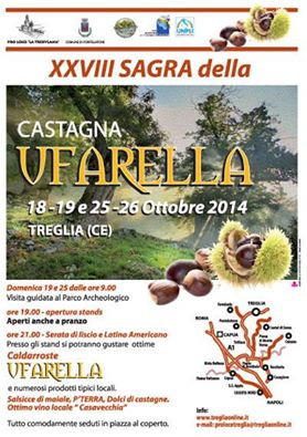 La “Ufarella”è una varietà autoctona del territorio trebulano, una castagna di piccole dimensioni ,con una buccia che si lascia sgusciare facilmente, molto gustosa anche se consumata cruda e particolarmente adatta alla preparazione di diverse varietà di dolci. Quella della castagna “Ufarella”, prodotto che da maggio dell’anno scorso fa parte delle tipicità della Campania, è una delle sagre storiche del casertano, essendo giunta alla sua 28° edizione. Ogni anno la “Pro Loco Trebulana” si adopera per la riuscita dell’evento, nel solco di una tradizione antica, legata al prodotto simbolo del territorio trebulano che affonda le sue radici nella tradizione culinaria contadina. la mattina del 19 e del 26 ottobre, inoltre, sarà possibile visitare il parco archeologico dell’ antica città di Trebula Balliensis, sito che sta riscuotendo consensi sempre maggiori, con delle visite guidate gratuite. Insieme alla castagna “ufarella” sarà possibile assaporare un’altra eccellenza del territorio trebulano, l’ottimo vino Casavecchia, altra tipicità enogastramica autoctona che in pochi anni si è affermata, quale prodotto di alta qualità, sul panorama enologico nazionale.