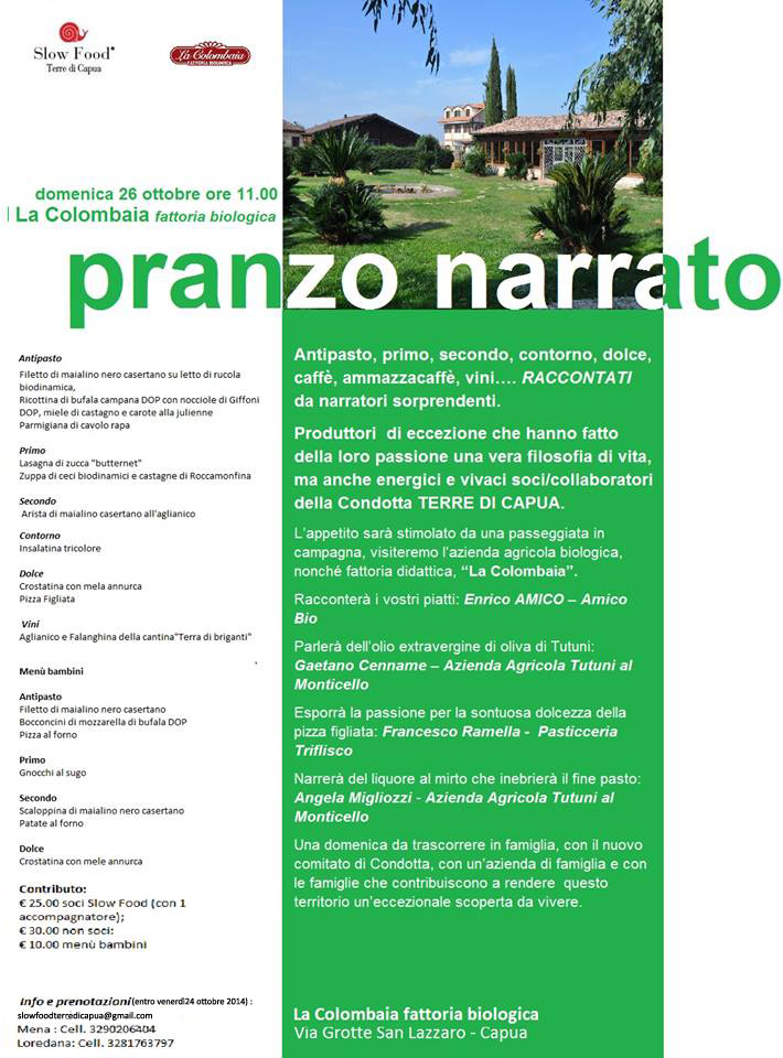 Un suggestivo connubio fra enogastronomia e cultura, questo propone la Slow Food Terre di Capua con la collaborazione dell’agriturismo “La Colombaia”, perché “Il cibo, in quanto piacere della vita,deve essere raccontato, così come la storia e il tempo che hanno plasmato gli straordinari prodotti della nostra terra, per diventare una combinazione in termini di attrattività per le nostre giovani generazioni. Il cibo deve diventare così cultura, memoria, progetto in rete”.