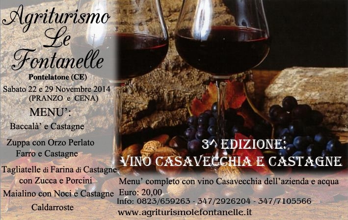 Un evento, quello del “Vino Casavecchia e Castagne”, che dopo il successo delle 2 altre edizioni, registra una partecipazione sempre piu’ vasta, ed un interesse crescente da parte della clientela . La manifestazione, a scopo puramente PROMOZIONALE, si terra’ ESCLUSIVAMENTE nei giorni di SABATO 22 e 29 NOVEMBRE, sia a pranzo che a cena. Il menu’, con vino Casavecchia della casa ed acqua compresi, ha un costo contenuto: 20,00 €., proprio per favorire il carattere “propagandistico” dell’evento. Si potranno anche degustare i Casavecchia Petronilla e San Laro, vini in bottiglia di produzione locale, ad un prezzo vantaggioso.