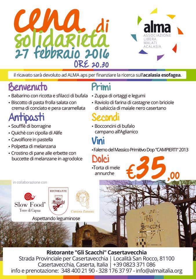 Slow Food Terre di Capua, Gino e Marilena del Ristorante “Gli Scacchi”, insieme con l’associazione ALMA (Associazione Libera Malati di Acalasia) per contribuire a dar voce a una malattia rara la cui genesi è ancora sconosciuta.