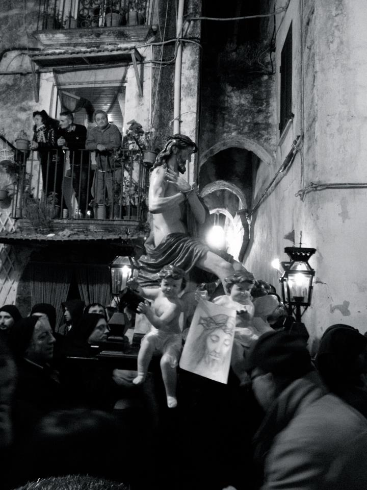 Il terzo è rappresentato dalla processione del Venerdì Santo che si snoda attraverso le strade del centro storico, illuminato dalla luce di caratteristici falò. I membri della confraternita del Santissimo Crocifisso portano a spalla le statue dei misteri dolorosi della Passione del Cristo Morto e delle Tre Marie, con un particolare andamento detto “a culunnella”.