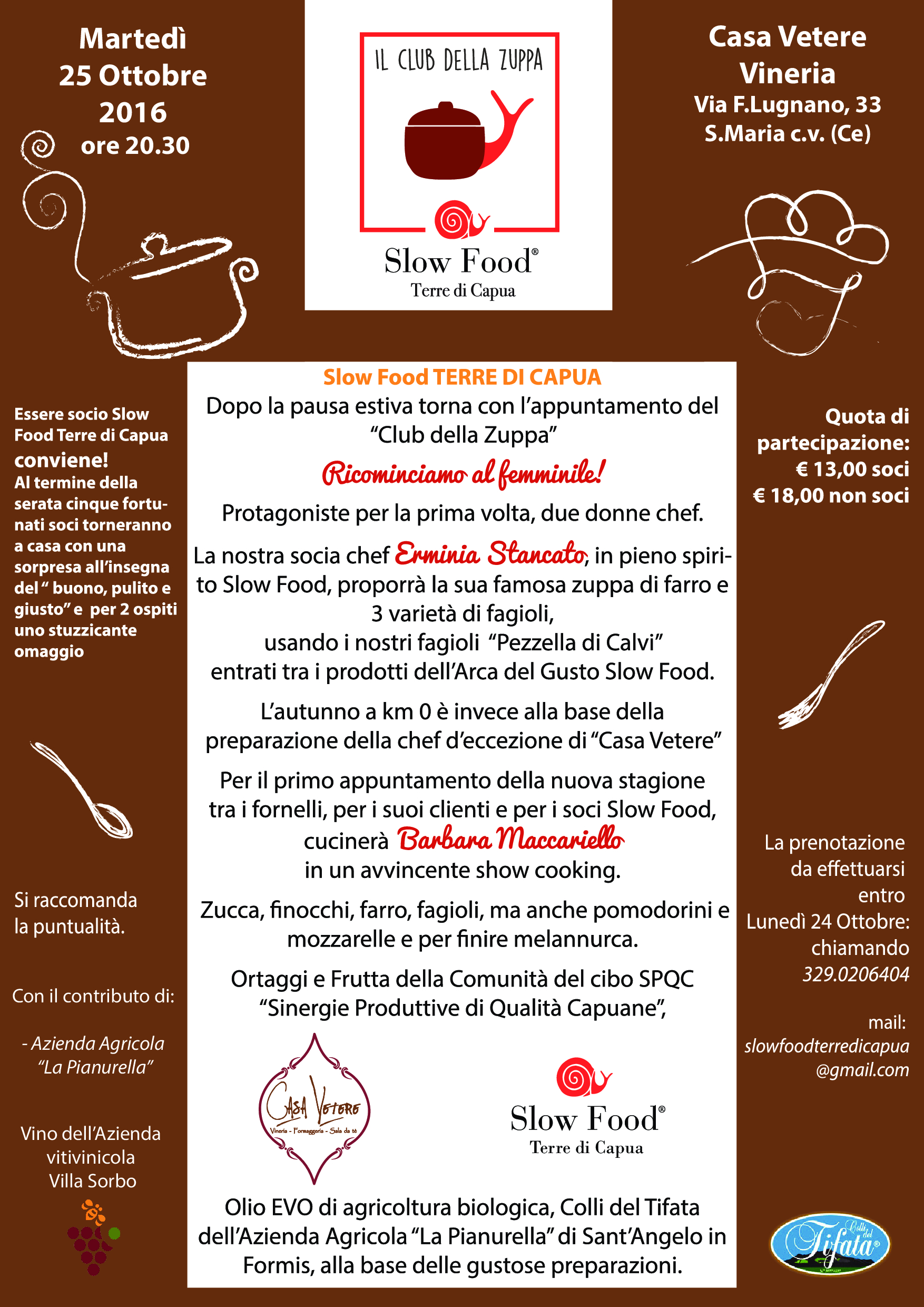 La socia chef Erminia Stancato proporrà la sua famosa zuppa di farro e 3 varietà di fagioli, usando fagioli “Pezzella di Calvi” entrati tra i prodotti dell’Arca del Gusto Slow Food. Si continua quindi l’anno all’insegna della valorizzazione dei legumi dopo ”Leguminosa 2016”, evento internazionale organizzato da Slow Food Campania a Napoli a marzo di quest’anno.
