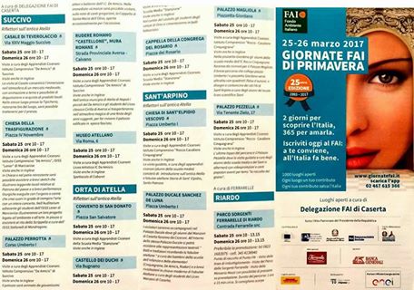 Sabato 25 marzo e domenica 26 marzo ritornano le giornate del FAI. In provincia di Caserta varie città hanno aderito all’iniziativa, soprattutto dell’agro atellano, in particolare ci saranno siti aperti a Succivo con il casale di Teverolaccio, la chiesa della Trasfigurazione, l’apertura di Palazzo Perrotta e la visita al Castellone delle mura romane. Ad Orta di Atella, invece, apriranno il convento di San Donato, il Castello dei Duchi e la cappella della Congrega del Rosario mentre a Sant’Arpino sarà possibile visitare la chiesa di Sant’ elpidio vescovo, il Palazzo Ducale Sanchez de Luna , palazzo Magliola e palazzo Pezzella. Apertura programmata anche a Riardo, nell’Alto Casertano, dove sarà possibile visitare il parco delle sorgenti Ferrarelle di Riardo