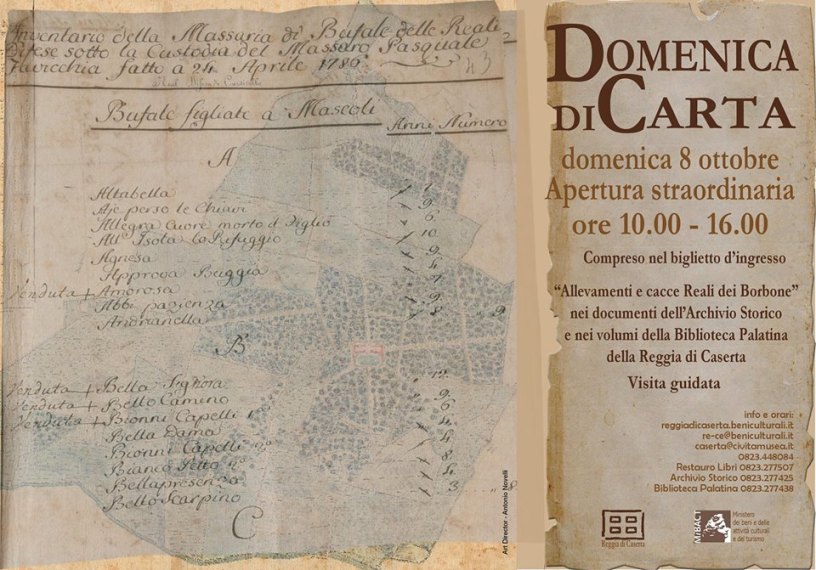 In aderenza all’evento “Domenica di Carta 2017” domenica 8 ottobre ci sarà l’apertura straordinaria di biblioteche e archivi statali promossa dal Ministero dei Beni e delle Attività Culturali e del Turismo per “valorizzare non solo i musei e aree archeologiche, ma anche i monumenti di carta patrimonio altrettanto imponente e ricco conservato e valorizzato in splendidi luoghi della cultura”. La Reggia di Caserta aderirà all’ iniziativa con l’apertura dell’Archivio Storico, l’appuntamento, inoltre, sarà arricchito da una visita guidata dal tema “Allevamenti e cacce reali dei Borbone” che verterà sulla storia dei Siti Reali in Terra di Lavoro attingendo ai documenti dell’Archivio Storico e ai volumi della biblioteca Palatina. La documentazione in questo senso è abbastanza ricca, lo si deve soprattutto alla passione smodata del sovrano Carlo di Borbone per la caccia e la vita all’aria aperta; il Re durante il suo regno creò molte Real Tenute di caccia, peraltro dislocate in un’area molto vasta che comprendeva una vasta parte del casertano e parte del Sannio. Durante l’iniziativa saranno mostrati tanti documenti antichi, e per certi versi inediti, come registri contabili e ricevute di pagamento della Real Tenuta di Carditello, oppure gli inventari della Real Bufaleria, le rendicontazioni relative alle entrate derivanti dal commercio di bestiame, oltre a documenti sul personale che lavorava in questi siti e quelli relativi alla vendita dei prodotti caseari. L’evento sarà arricchito da una degustazione che avverrà nella mattinata di prodotti caseari gentilmente offerti dal caseificio “Il Casolare” di Alvignano