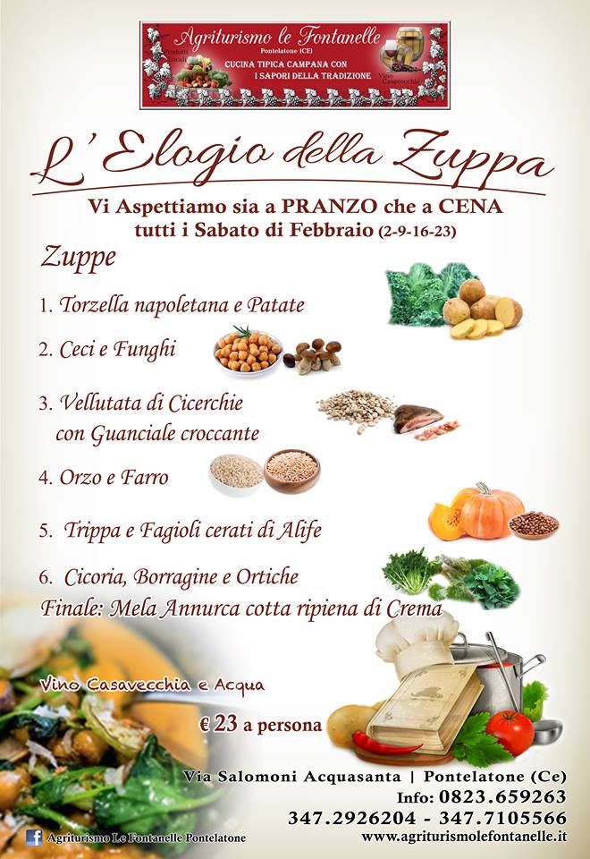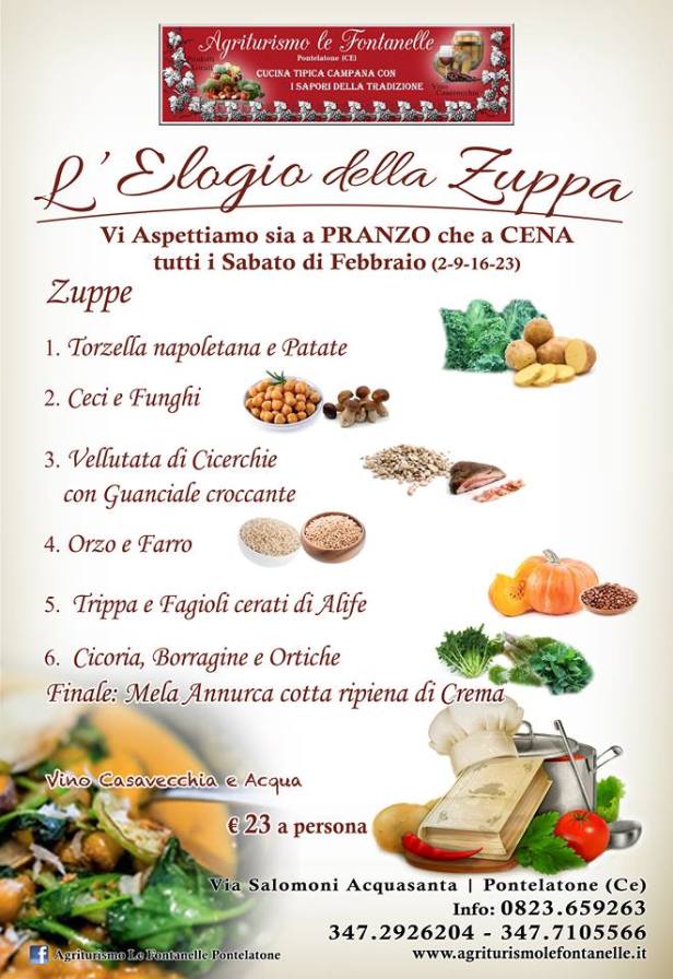L’ Elogio della Zuppa è un evento, dell’ Agriturismo Le Fontanelle, dedicato ai piatti poveri per eccellenza: le zuppe; che affondano le proprie radici nella cultura contadina più autentica. I tempi cambiano, il mondo si trasforma, quelli che originariamente erano piatti cosiddetti di recupero, diventano prelibati, da poveri divengono ricercati, non facilmente reperibili, ma sempre succulenti ed appetitosi, intrisi di reminiscenze agresti . Pertanto questa è la stagione ideale per gustare una bella zuppa calda, per saziare il palato e riscaldarsi dopo una giornata grigia, con il freddo, le temperature rigide ed il buio che investe presto il giorno . Sono i piatti giusti per scaldarsi e ritrovare il giusto tepore, vezzeggiano se si è soli, fanno sentire in ‘famiglia’ se si è in compagnia, dando calore al corpo ed emozione allo spirito. Abbiamo ,a livello regionale e nazionale, una varietà molto vasta di zuppe, pertanto diventa difficile orientarsi in questo labirinto di sapori e tradizioni. Sono sei in totale quelle proposte : Svetta sicuramente per originalità la ZUPPA con Borragine,Ortica e Cicoria, tutte erbe spontanee raccolte a mano in piena campagna dalla titolare delle Fontanelle: Carmelina. Ma nel complesso risultano tutte interessanti, soprattutto perché rievocano un mondo bucolico che si sta gradualmente dipanando risulta ancora ricercato, almeno turisticamente. Il finale sarà “allietato” dalla mela Annurca, di nostra produzione, cotta al forno farcita con crema fatta in casa. E’ un menu’ colmo di specialità facenti parte dei cibi della cucina povera del territorio, ricche di sapori, fantasia, profumi, sensazioni e ricordi. Si potranno anche degustare i Casavecchia Petronilla e San Laro, vini in bottiglia di nostra produzione, ad un prezzo vantaggioso. E’ prevista l’esposizione e vendita Vino Casavecchia in bottiglia, Salumi, Formaggi, Miele, Olio Evo di Corniola,Verdure. Tutti i Sabato di Febbraio a Pranzo e Cena.