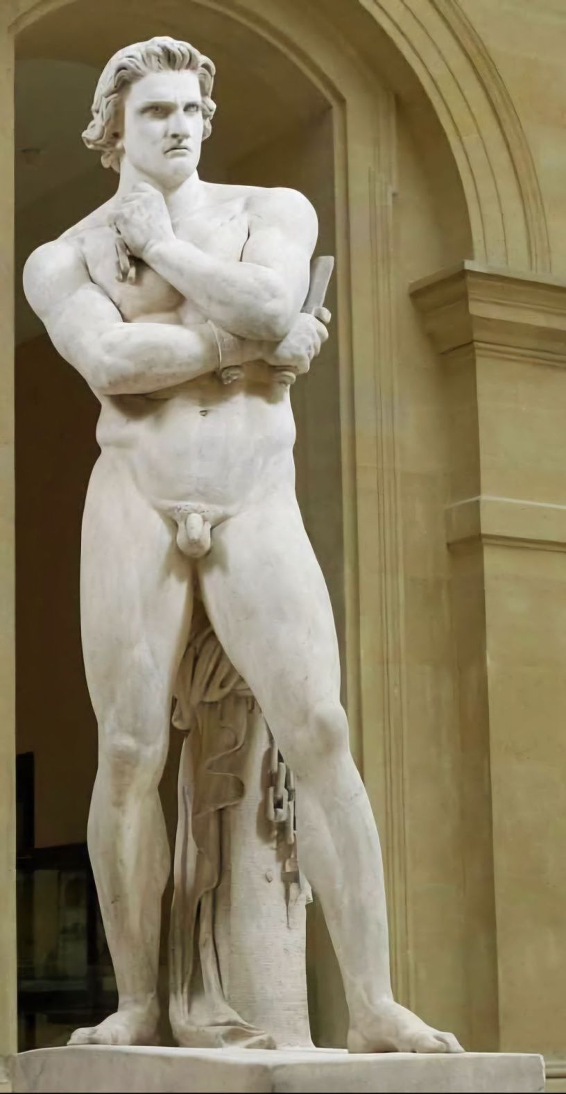 ๐๐ฉ๐๐ซ๐ญ๐๐๐จ, lโantico schiavo e gladiatore romano. Lโopera, scolpita con grande maestria, presenta una delicata consistenza e lucentezza, esaltando i dettagli anatomici del protagonista. Spartaco รจ raffigurato in posizione eretta, nudo, con unโarma in mano e un volto determinato, espressione di un forte spirito di resistenza. I suoi muscoli sono finemente scolpiti, mettendo in risalto la sua forza e il suo coraggio come gladiatore. Sebbene non sia tra le principali esposizioni del Louvre, resta unโopera dโarte sorprendente.