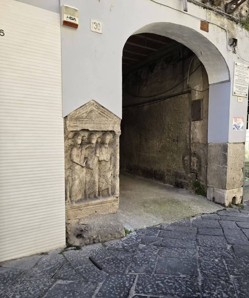 Questa testimonianza, visibile a chiunque percorra l’arteria cittadina, affiora dalla quotidianità urbana come un ponte tra presente e passato. Le tre figure in rilievo, avvolte nelle loro vesti e scolpite con sorprendente naturalezza, sembrano osservare il tempo che scorre, ignare del traffico moderno e delle serrande abbassate. Un frammento che resiste, quasi a voler ricordare che qui, un tempo, si viveva il pieno splendore della 𝐂𝐚𝐩𝐮𝐚 𝐯𝐞𝐭𝐮𝐬, quella che Cicerone definì “la seconda città dell’impero dopo Roma”.