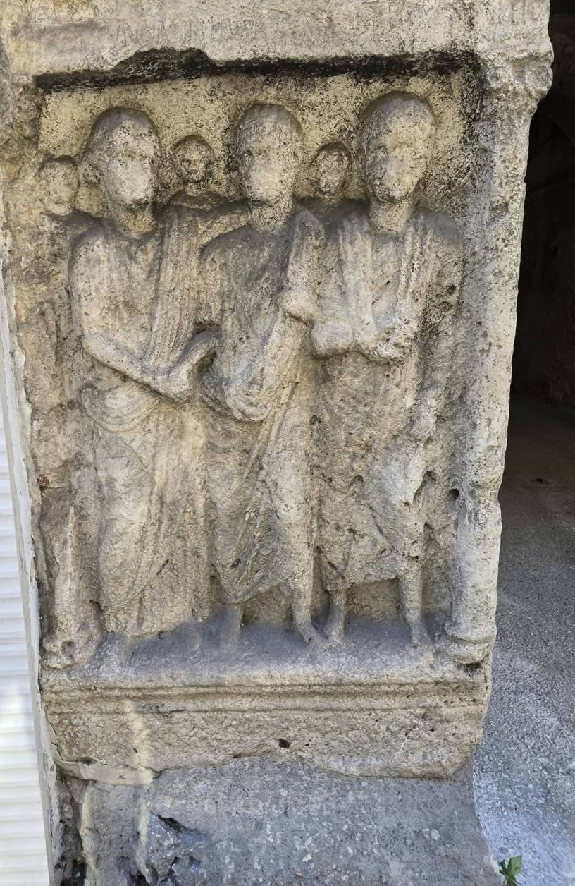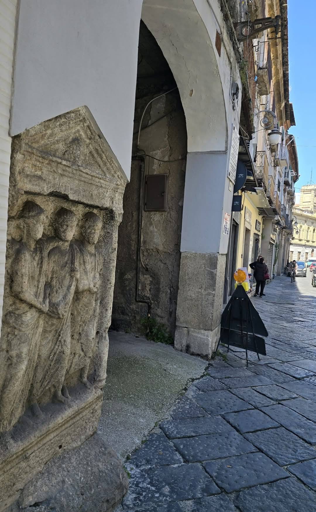 Questa testimonianza, visibile a chiunque percorra l’arteria cittadina, affiora dalla quotidianità urbana come un ponte tra presente e passato. Le tre figure in rilievo, avvolte nelle loro vesti e scolpite con sorprendente naturalezza, sembrano osservare il tempo che scorre, ignare del traffico moderno e delle serrande abbassate. Un frammento che resiste, quasi a voler ricordare che qui, un tempo, si viveva il pieno splendore della 𝐂𝐚𝐩𝐮𝐚 𝐯𝐞𝐭𝐮𝐬, quella che Cicerone definì “la seconda città dell’impero dopo Roma”.