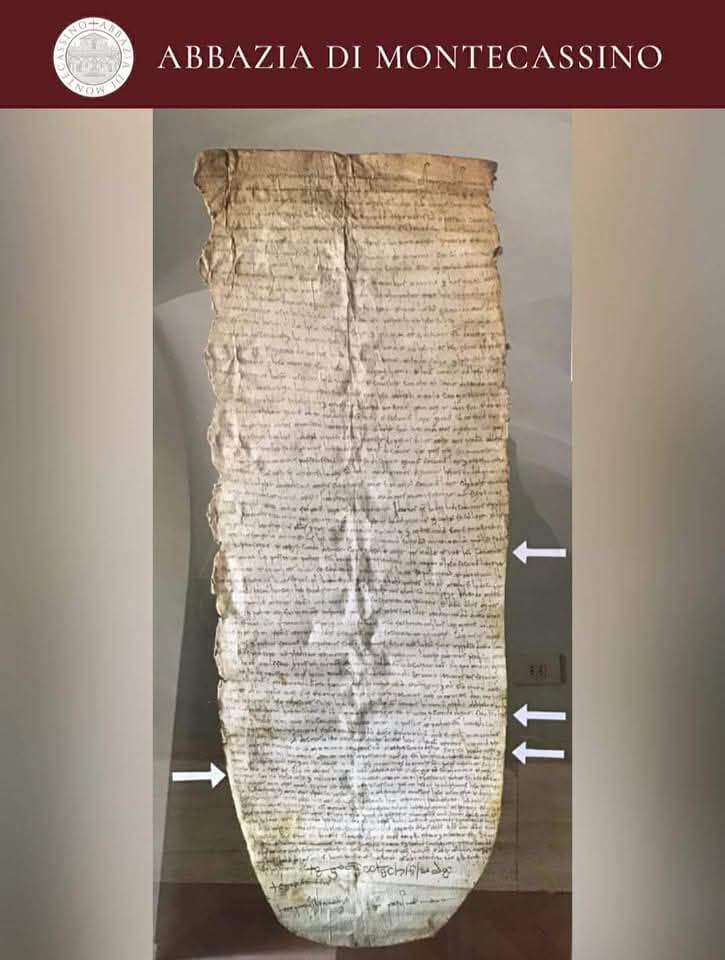 Nella foto: lโoriginale pergamena conservata nellโArchivio dellโAbbazia di Montecassino.