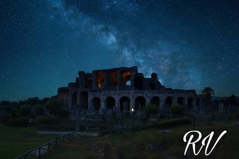 L’intelligenza artificiale ha saputo donarci una prospettiva onirica e suggestiva di scorci ben noti della conurbazione casertana, elevandoli sotto una coltre di stelle che raramente il nostro sguardo cittadino può ammirare con tale nitidezza. Palazzi, piazze e monumenti familiari si stagliano ora in un contesto cosmico, dove la familiare illuminazione urbana dialoga con la luce antica e misteriosa delle costellazioni.