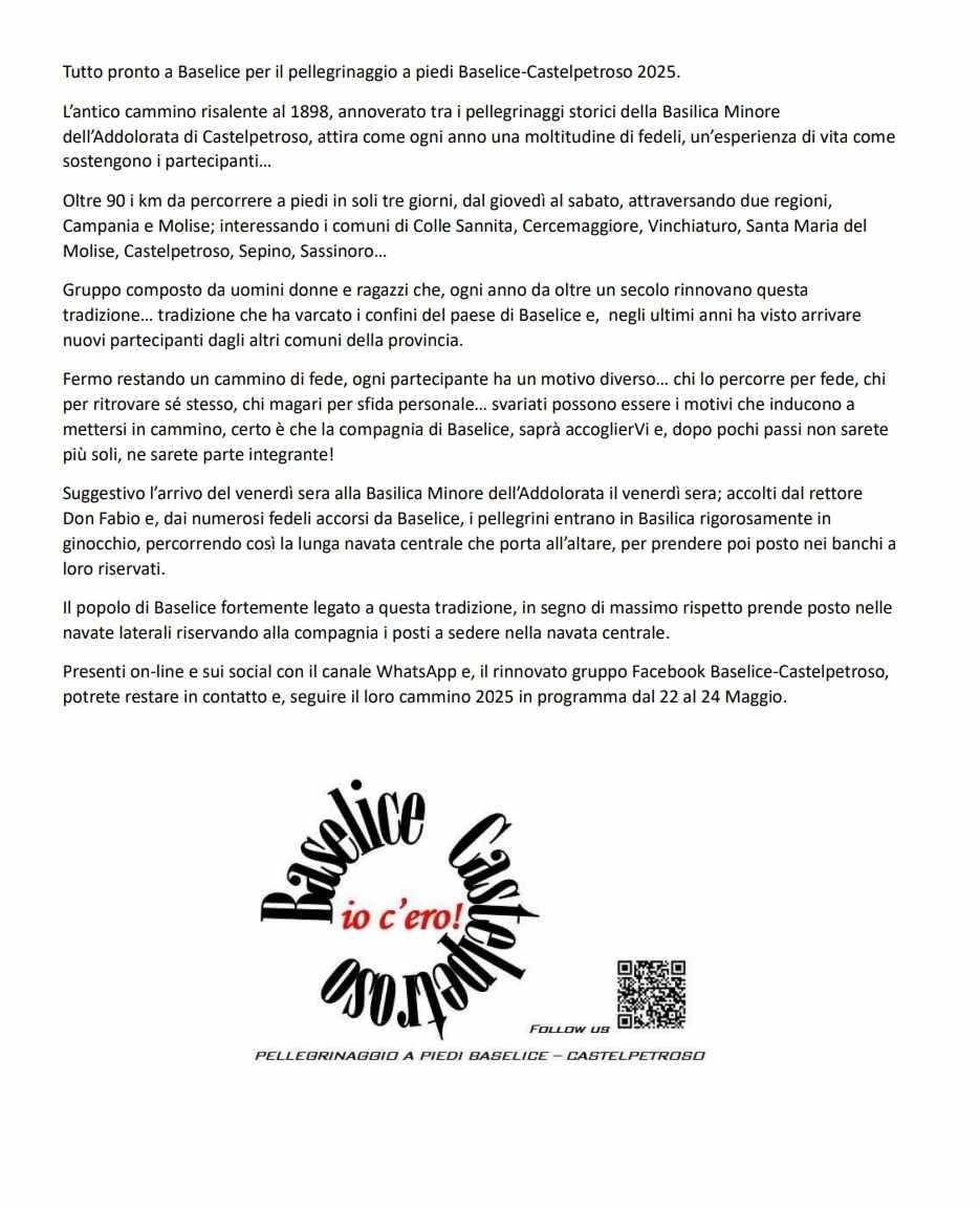 Dal 22 al 24 maggio 2025 si rinnova lo storico pellegrinaggio a piedi da Baselice alla Basilica Minore dellโAddolorata di Castelpetroso, nato nel 1898 e oggi tra i piรน sentiti del Sud Italia. Unโesperienza intensa di fede e condivisione, che ogni anno coinvolge decine di fedeli โ uomini, donne e ragazzi โ in un percorso di oltre 90 km in tre giorni, attraversando Campania e Molise.