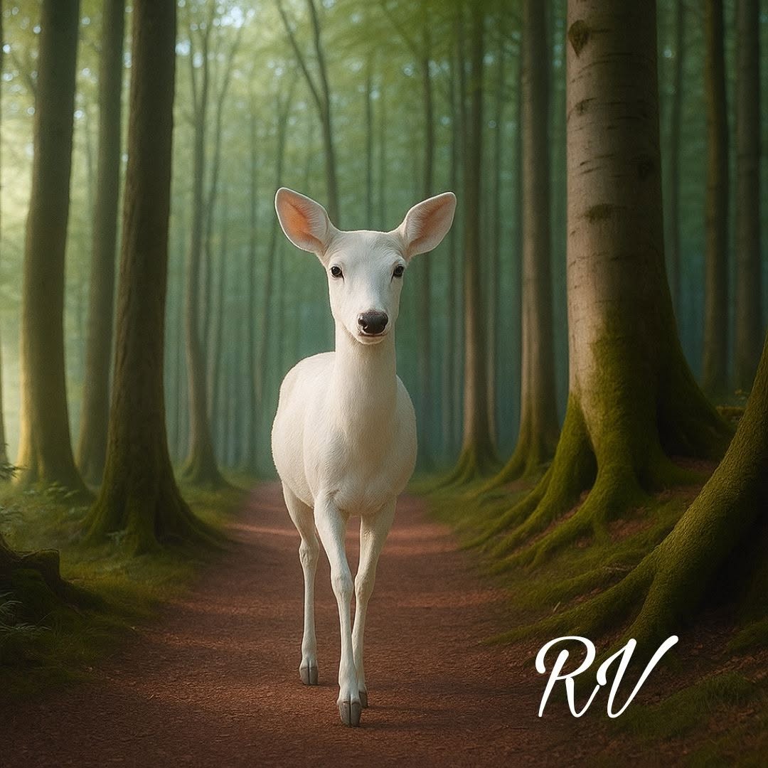 Nella seconda immagine, sempre generata con l’intelligenza artificiale, abbiamo immaginato la Cerva Bianca ormai adulta, divenuta una figura quasi sacra, simbolo di protezione e leggenda.