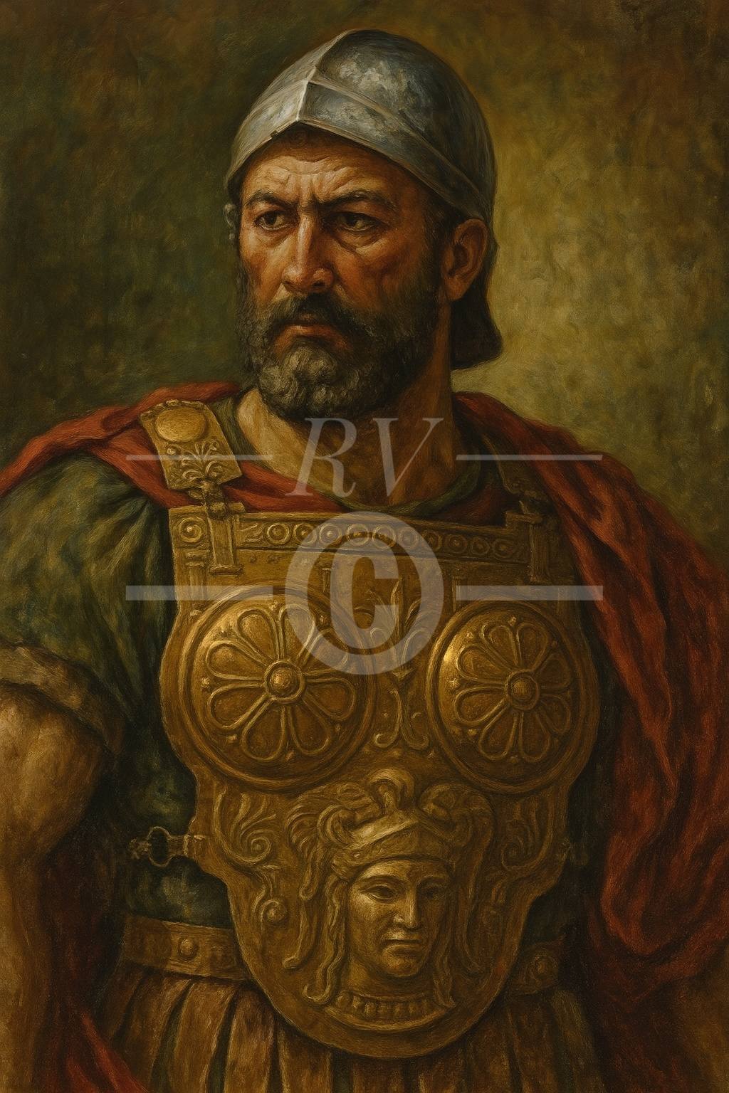 Con l’aiuto dell’intelligenza artificiale abbiamo ricostruito unโimmagine provando ad immaginare I condottiero Annibale che indossava questa corazza