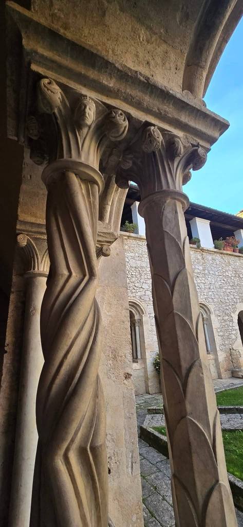 Nonostante le tre scomuniche papali ricevute nel corso della sua vita, spesso attribuite alla sua presunta vicinanza a pratiche considerate esoteriche, il legame tra Federico II e l’abbazia non venne mai meno. A testimonianza di questo rapporto, il sovrano fece scolpire nella bifora del chiostro un messaggio simbolico, non immediatamente evidente. Nei capitelli della bifora sono raffigurati tre volti: quello dell’imperatore, affiancato da due figure fondamentali per la sua formazione, 𝐥’𝐚𝐛𝐚𝐭𝐞 𝐆𝐢𝐨𝐯𝐚𝐧𝐧𝐢 𝐞 𝐏𝐢𝐞𝐫 𝐝𝐞𝐥𝐥𝐞 𝐕𝐢𝐠𝐧𝐞.